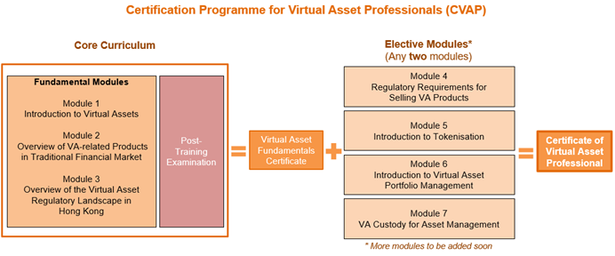 The elective modules mainly focus on activities related to VA dealing and advisory as well as VA-related product distribution, covering topics, including tokenisation, custody, selling conduct, and portfolio management. This structure allows participants to tailor their learning experiences to meet their specific professional development needs.